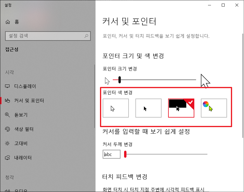 윈도우10 마우스 커서 포인트 크기및 색변경