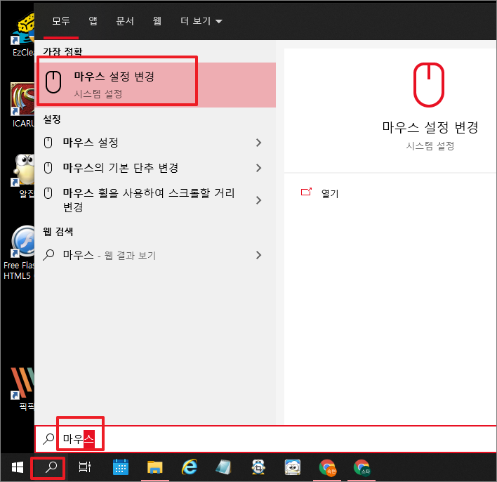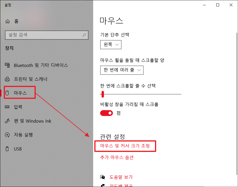 설정창에서 마우스>[마우스 및 커서 크기 조정]을 누릅니다.