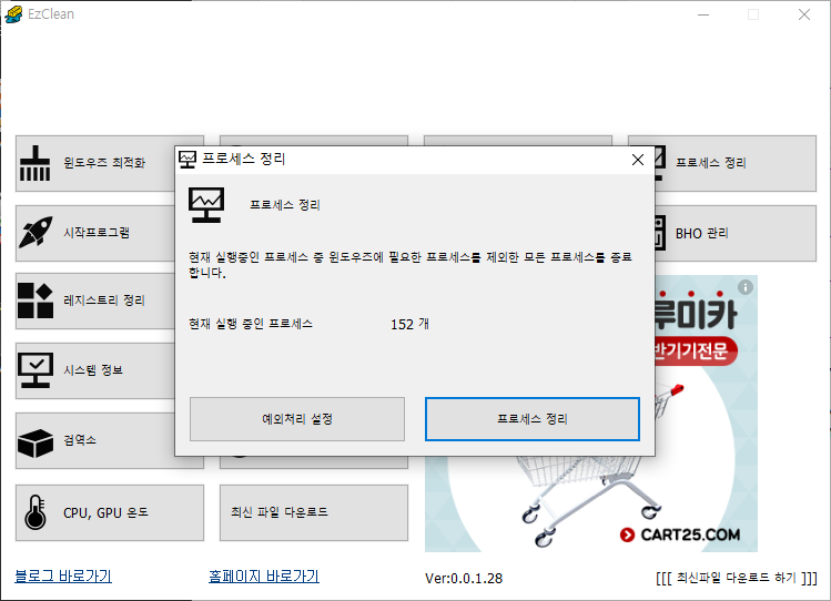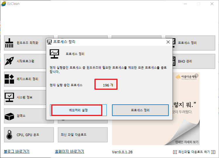 이 프로그램의 여러 기능중 가장 큰 장점이 바로 [프로세스 정리] 기능입니다.