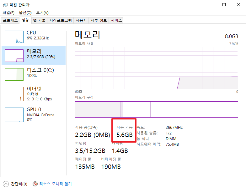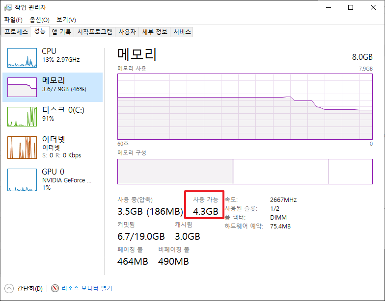 먼저 작업관리자를 통해 현재의 메모리를 체크해봤습니다.