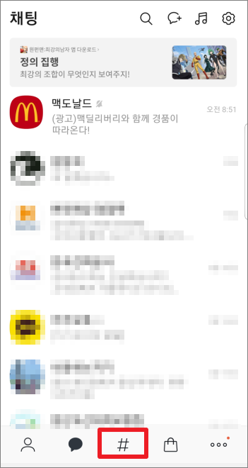 카톡을 켠후 하단에 있는 #을 누릅니다.