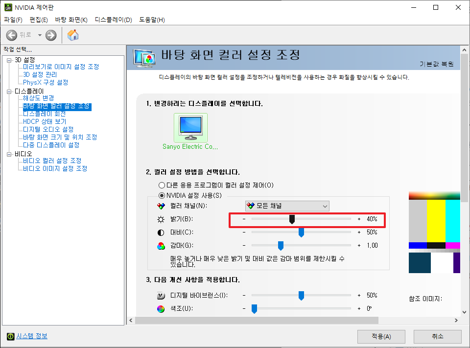 [NVIDIA 제어판]에서 [바탕화면 컬러 설정 조정]을 누른후 [NVIDIA 설정 사용]을 체크합니다.