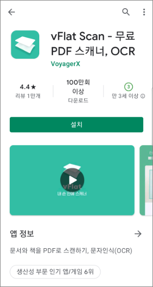 구글 플레이스토어에서 vFlat를 검색후 아래와 같은 제목을 설치합니다.