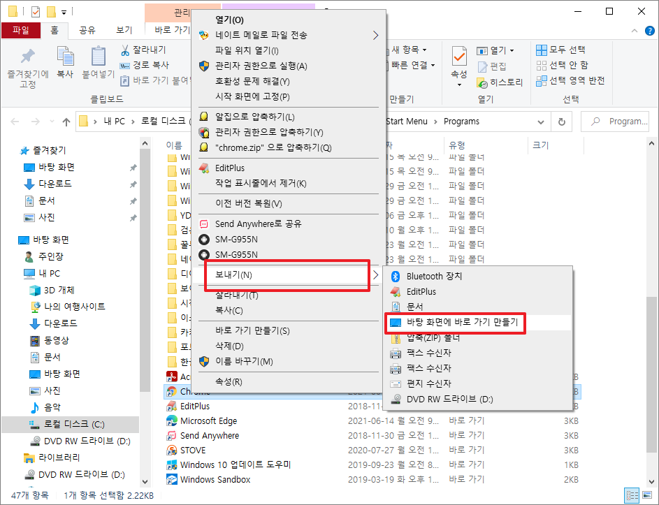 보내기에서 [바탕화면에 바로가기 만들기]를 누르면 됩니다.