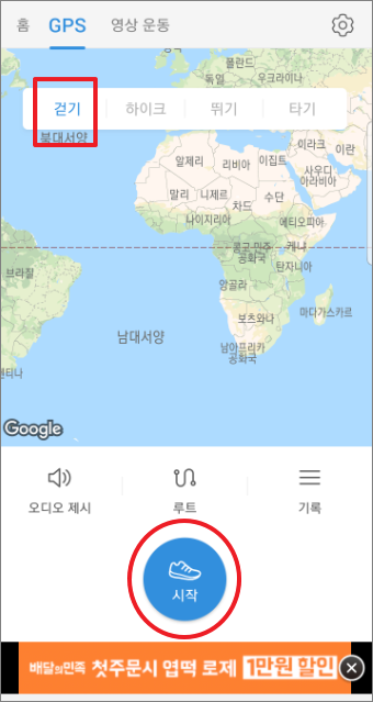 기본 걷기로 되어 있고 시작을 누르면 지금부터의 운동이 기록이 됩니다.