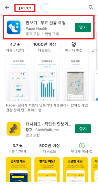 구글 플레이스토어에서 pacer을 검색후 설치합니다.