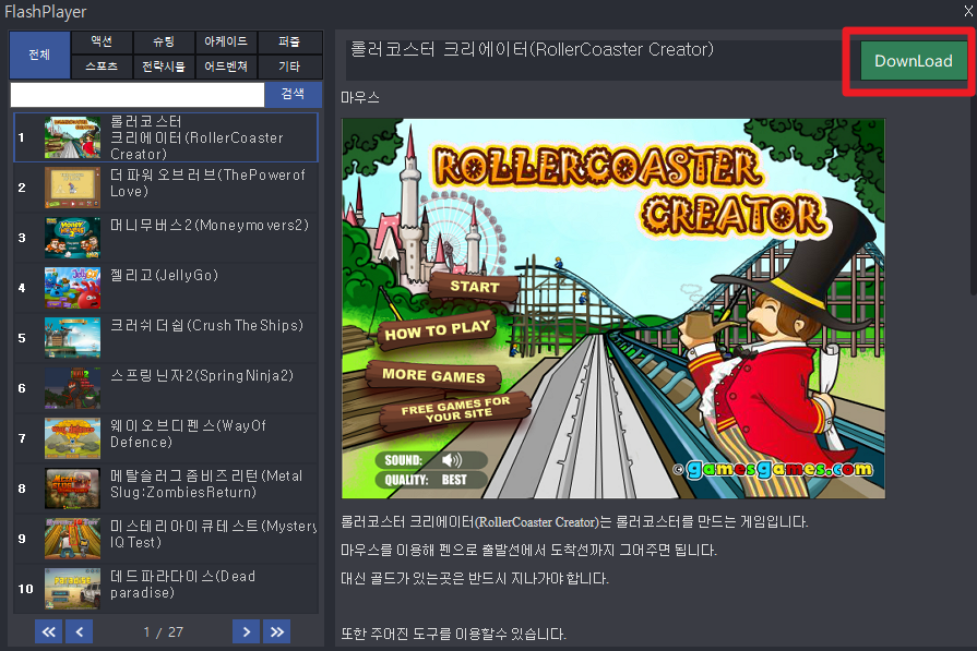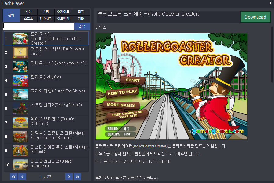 프로그램이 설치되었다면 게임을 찾은후 Download를 누르면 해당 swf파일을 다운로드후 바로 게임을 구동시켜줍니다.
