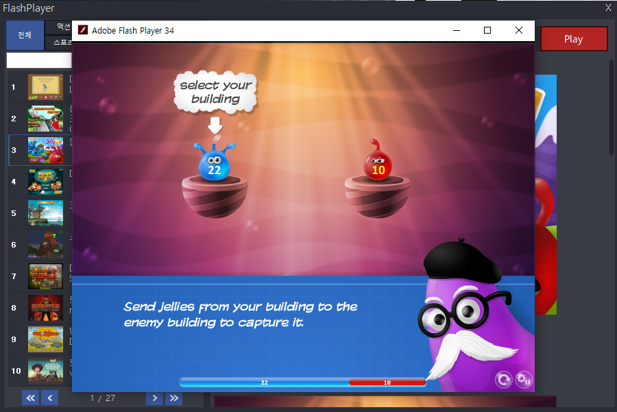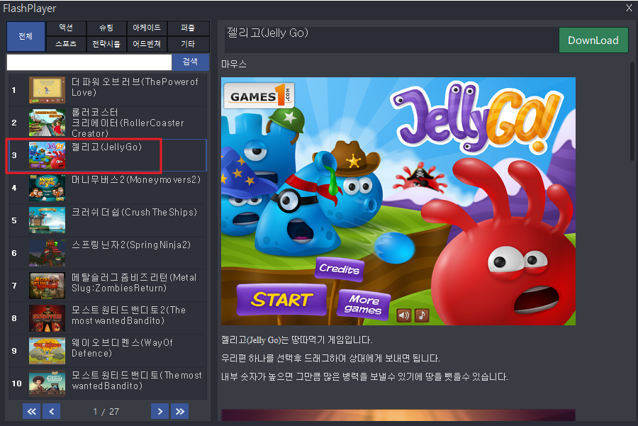 플래시플레이어에서 젤리고를 검색후 download를 누르면 게임이 시작됩니다.