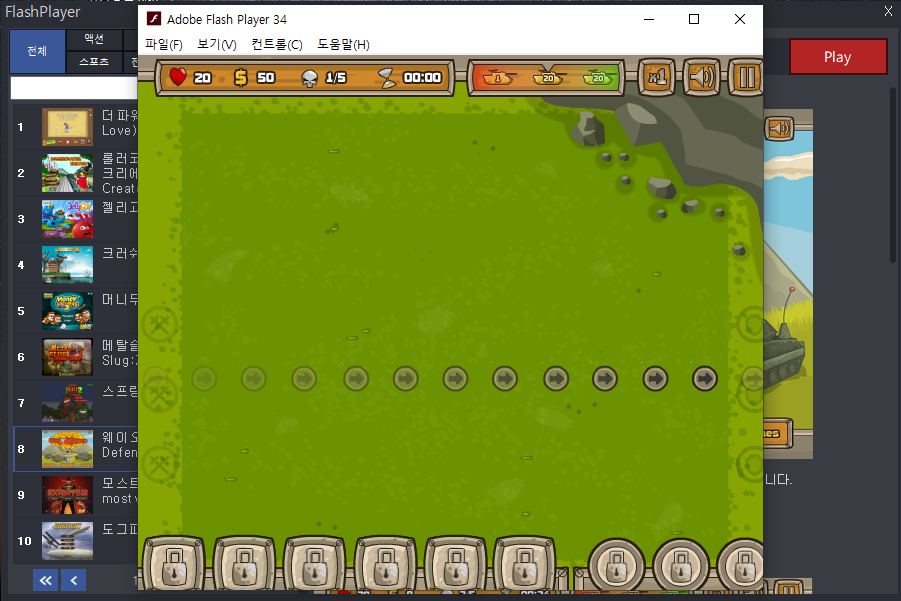 웨이 오브 디펜스(Way of Defence)의 게임을 플레시플레이어에서 실행해보죠.