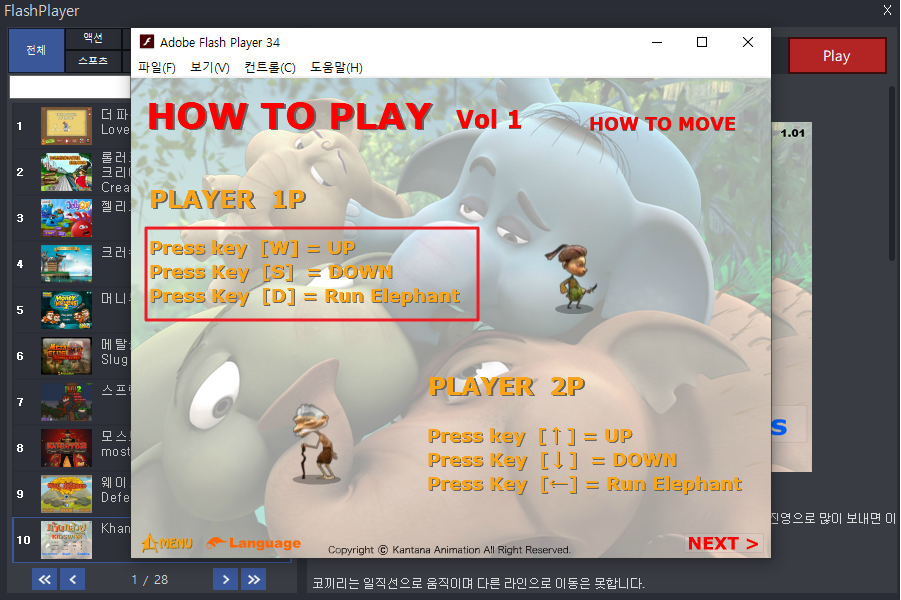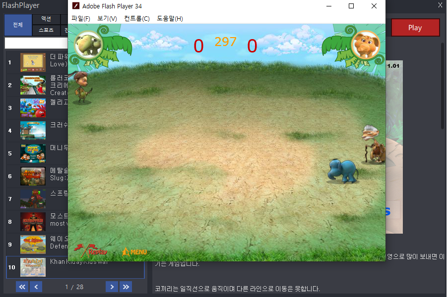 아래는 플래시플레이어에서 게임을 실행해서 동작되는 이미지입니다.