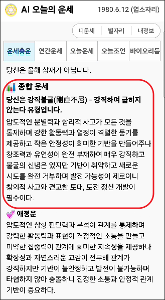 예를 들어 오늘이 "정화(丁火)" 일주이고 오늘의 기운이 "목(木)"이면, "화목상생 - 불이 나무를 만남"처럼 오행의 상생상극까지 알려주는 거죠.