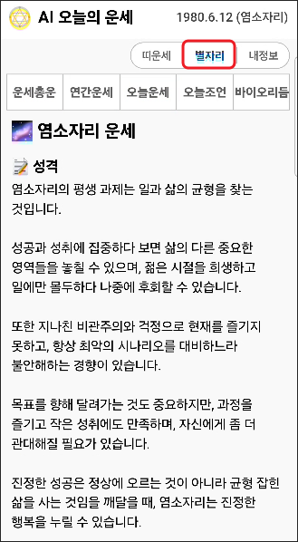 생년월일 입력하면 별자리가 자동 계산되고, 해당 별자리의 오늘 운세를 확인할 수 있습니다.