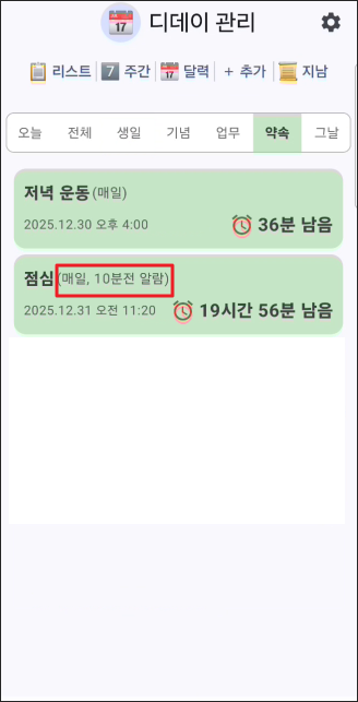 업무나 약속 카테고리에서 매일 반복을 선택하면 매일 같은 시간에 알람이 울립니다. 특정 요일만 반복하고 싶으면 월, 화, 수, 목, 금, 토, 일 중에서 원하는 요일을 선택하면 됩니다.