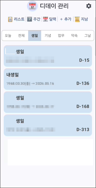 리스트 화면에서는 오늘, 전체, 생일, 기념, 업무, 약속, 그날 7개의 탭으로 일정을 필터링해서 볼 수 있습니다. 오늘 탭에서는 오늘 해당하는 일정만 모아서 보여주고, 각 카테고리 탭에서는 해당 종류의 일정만 볼 수 있습니다. 일정이 많아져도 원하는 일정을 빠르게 찾을 수 있습니다.