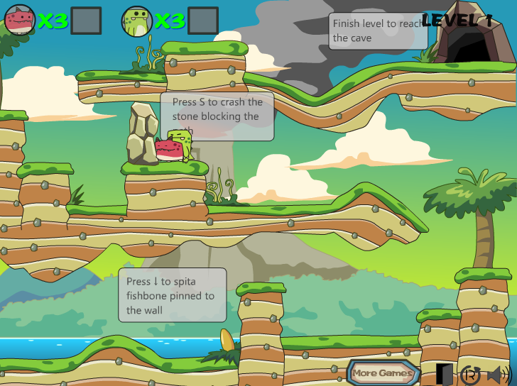 이 게임은 2인용으로 게임을 할수도 있지만 혼자서도 2개의 공룡을 조정을 해야지만 통과를 할수가 있습니다.