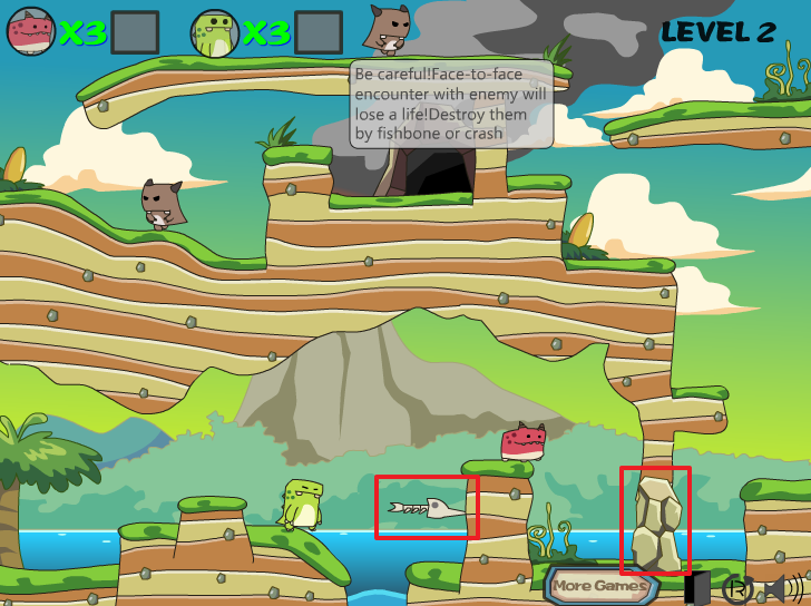 먼저 녹색공룡의 Down키를 이용하여 작살을 쏘고 그걸로 붉은공룡과 녹색공룡이 차례로 넘어갑니다.