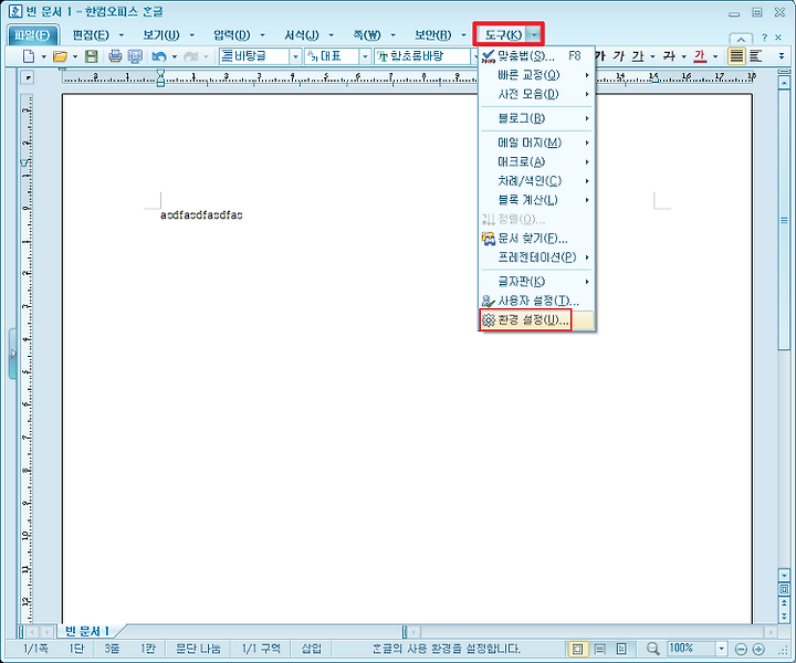 그럼 먼저 아래한글(hwp)을 실행한후 상단메뉴의 도구> 환경설정을 누릅니다.