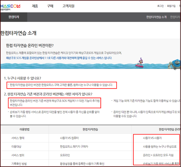 한컴타자연습 온라인버젼과 오프라인 버젼의 차이점입니다.