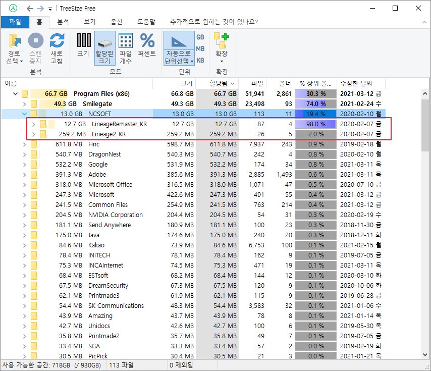 현재 설치된 프로그램및 파일의 용량이 크기별로 나열이 되어 있습니다.