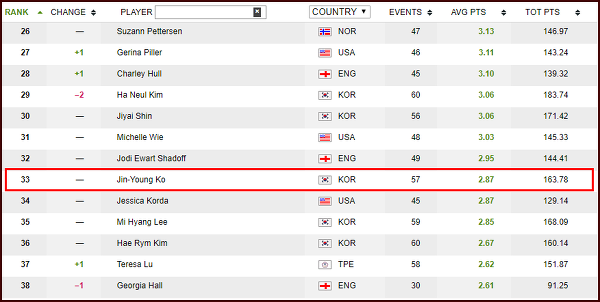 고진영선수의 여자골프 세계랭킹을 찾아보니 현재 33위에 올라있네요