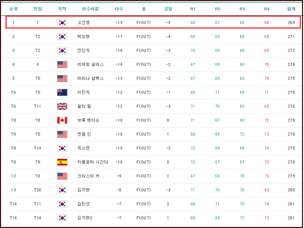 박성현선수와 전인지 선수가 끝까지 맹추격을 하였으나 끝내 고진영선수가 우승을 차지했네요