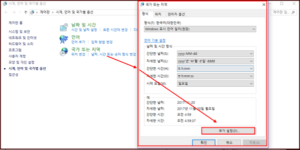 설정> 시간및 언어 > 날짜및 시간 > 추가날짜, 시간 및 지역설정을 클릭합니다.