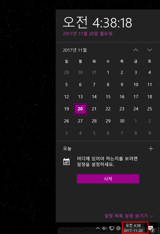 그때는 작업표시줄에 날짜,시간표시에 마우스 클릭을 하면 달력이 나옵니다.