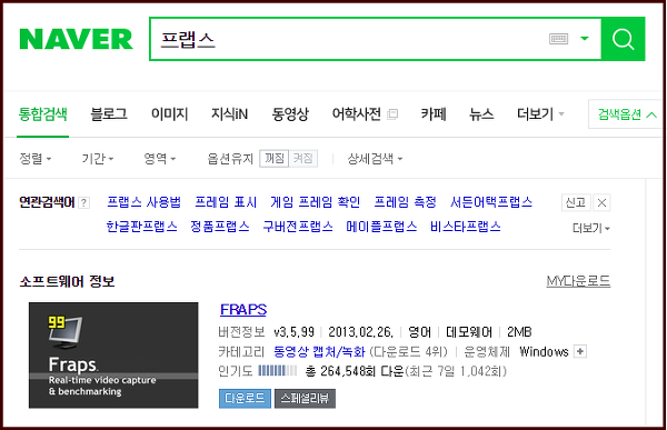 프랩스(fraps)의 버젼은 3.5.99이고 용량은 2MB입니다. 네이버 자료실을 통해서는 26만번이 다운로드 되었군요