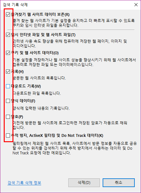 위 4개 항목은 체크해서 삭제를 해주는것이 좋겠네요. 다운로드 기록도 체크 삭제하는것이 좋겠습니다.