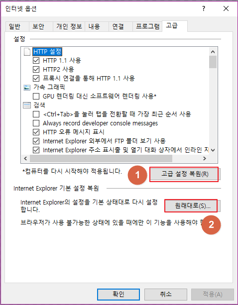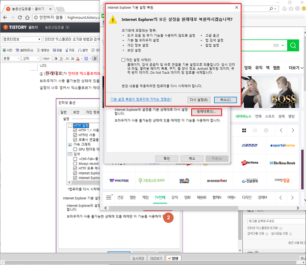 ② [원래대로]가 인터넷 익스플로러의 초기화입니다.