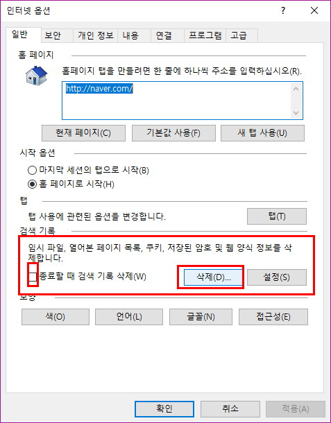 종료할때 검색 기록 삭제도 추천하는 옵션입니다.