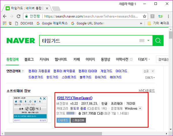 ▼ 타임가드는 예약종료를 편리하게 해주는 프로그램으로 용량은 782kb로 아주 작으며 버젼은 3.22입니다. 네이버 자료실을 통해서 다운로드를 받아보겠습니다.