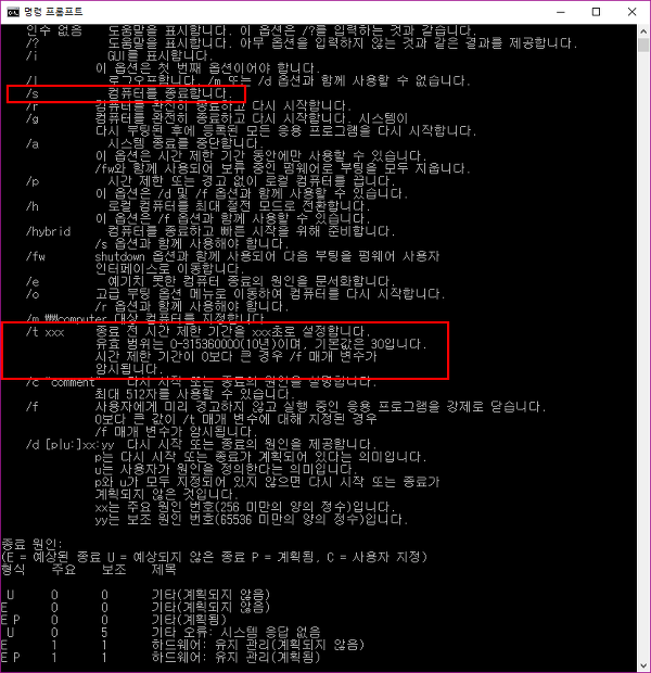 ▼ cmd화면에서 shutdown만 입력하면 다음과 같이 옵션들이 표시가 됩니다.