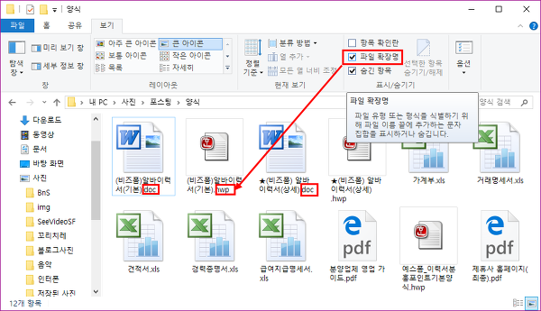 보기에서 파일확장명을 체크하면 파일의 확장자가 보이게 됩니다.