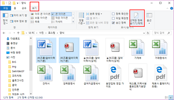 윈도우10에서는 파일및 폴더 숨김 항목을 체크표시로 바로 보기로 전환할수 있습니다.