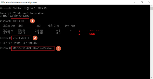 두번째에 있는 usb의 디스크 번호를 입력합니다. 1이 될수도 있고 2가 될수도 있지요