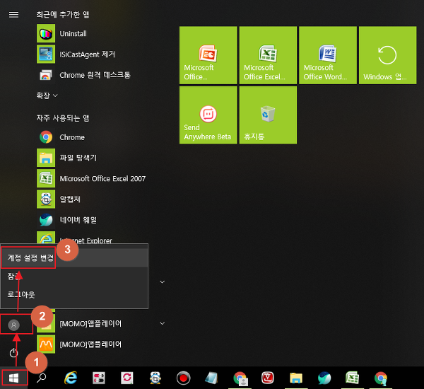 로그인 암호 해제를 위해서 윈도우10의 시작버튼을 눌러서 계정설정변경을 누릅니다.