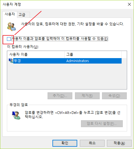 그러면 윈도우10 로그인 암호 해제가 됩니다.