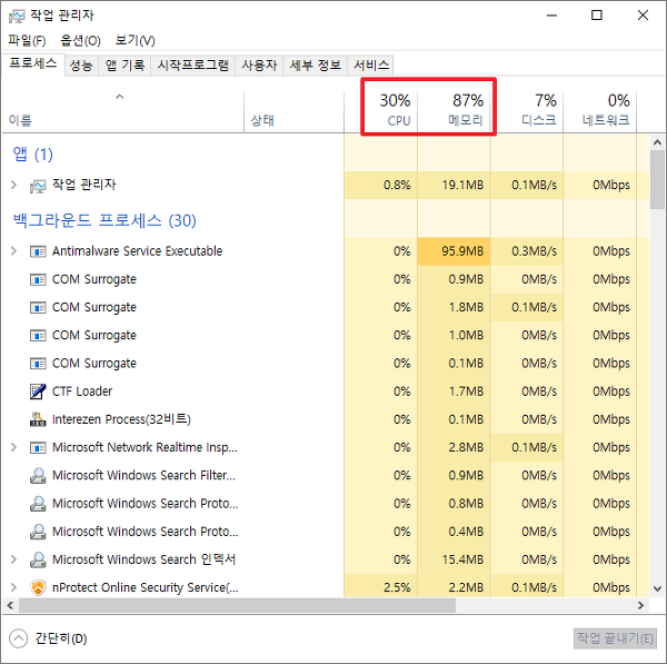 프로세스클린을 다운로드하기 전 작업관리자에서 현재 메모리 사용을 체크해봅니다.