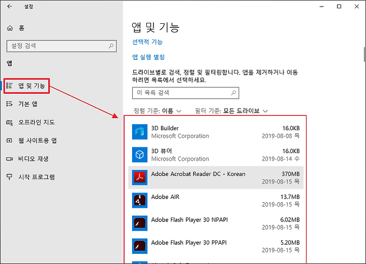 [앱및 기능]에서 전체 설치된 앱이 보입니다.