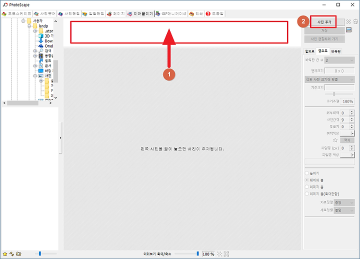 1의 빈곳에 탐색기를 실행시켜 사진을 선택한후 드래그하여 가져오던가 2의 사진추가를 눌러 직접 사진을 선택해주면 됩니다.