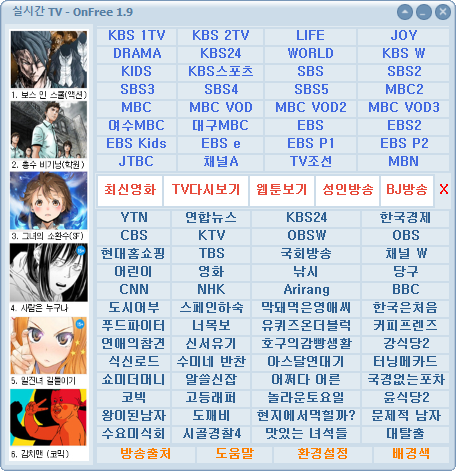 온프리티비 1.9는 프로그램에서 바로 플레이가 되어 영상이 보여지는 것이 아니라 해당 방송의 창을 열어주는 링크를 걸어놓은 것이네요.