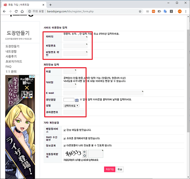 가입폼에 복잡해 보이지만 실제로는 아이디, 패스워드와 이름, 이메일등이 들어갑니다.