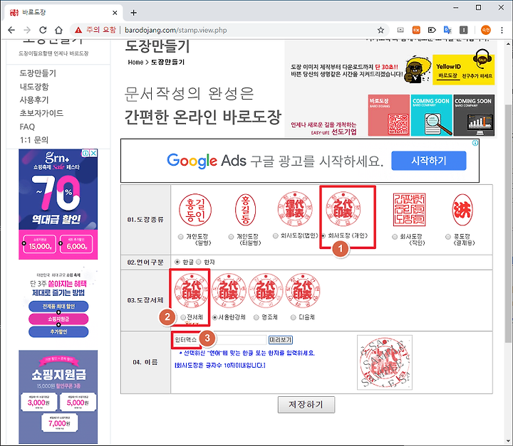 도장의 종류를 선택한후 도장서체를 선택합니다.