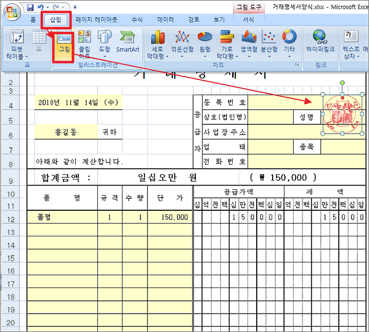 이 도장을 엑셀의 견적서에 불러오기를 해볼까요?