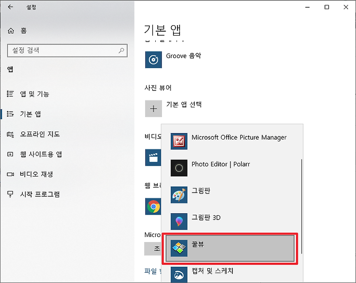 이와같이 사진을 보거나 어떤 파일을 실행하였을때 가장 기본으로 연결되는 프로그램을 설정하는것이 기본앱설정입니다.