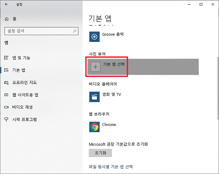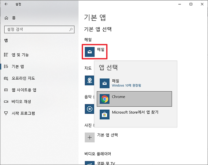 앱 설정에서 기본앱을 클릭하면 우측에 기본앱 관련 내용이 나옵니다.