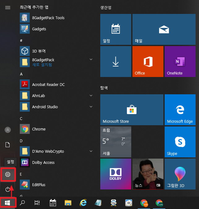 기본앱 설정을 하기 위해 윈도우10의 시작버튼을 누르고 설정을 누릅니다.