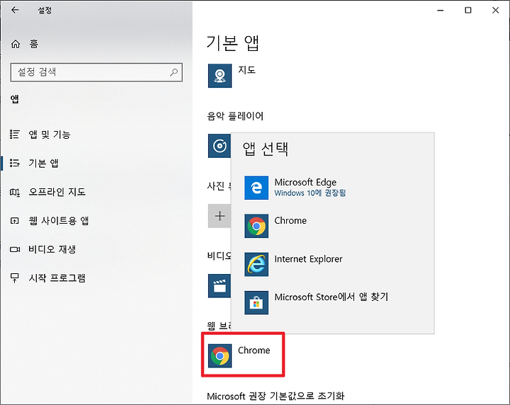 윈도우10 기본앱설정 - 기본 브라우저 크롬설정