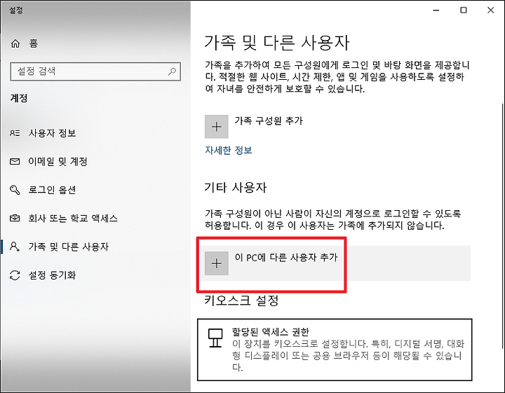 새로운 창이 뜨면서 기타 사용자에 [이 PC에 다른 사용자 추가]가 나옵니다.